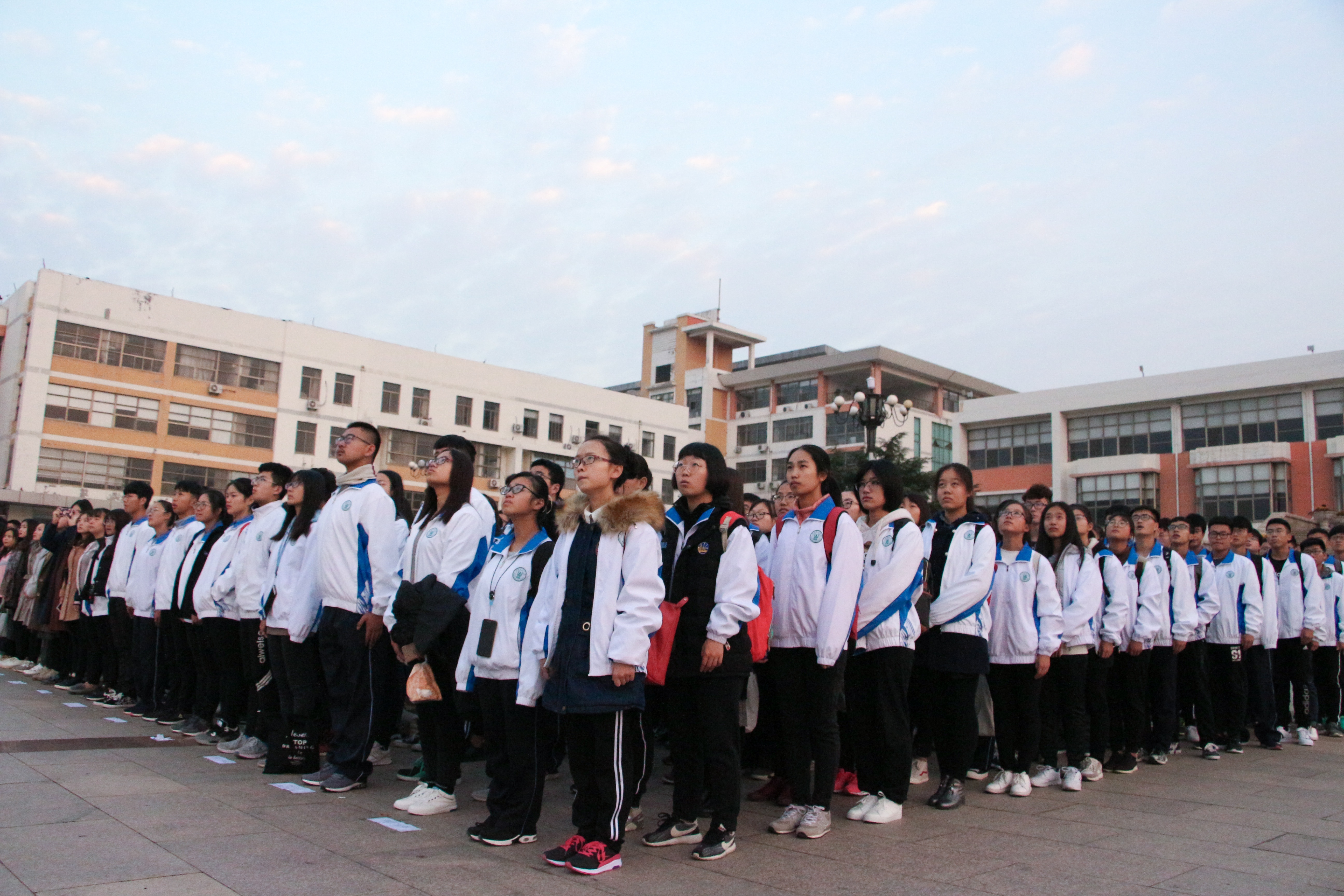 清晨,国旗护卫队披着阳光,迈着整齐划一的步伐,护送鲜艳的五星红旗从拱桥行至升旗台。升旗手振臂一挥,五星红旗在庄严的国歌声中冉冉升起,全体学生高唱国歌,满怀无比豪迈和喜悦之情行注目礼,仰望五星红旗在风中飘扬。