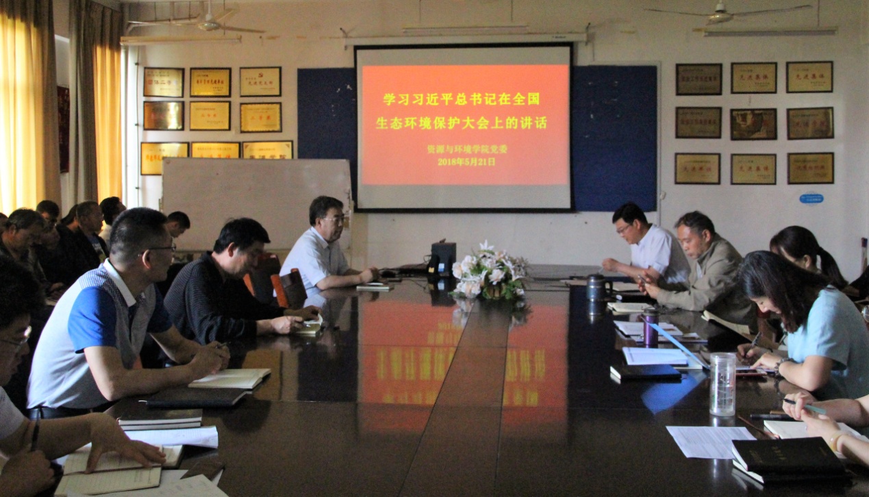 5月24日,9001cc金沙以诚为本组织教职工于化学楼会议室集中学习习近平总书记在全国生态环境保护大会上的讲话,会议由学院党委书记孙丙高主持。